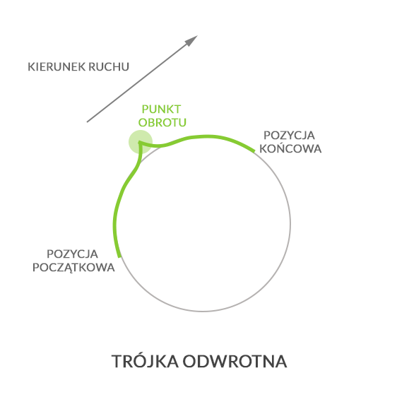 • trójka odwrotna (ang. bracket)  – podobnie jak w przypadku trójki obrót wykonywany jest w jednym okręgu, oraz zmienia kierunek jazdy i krawędź, ale kierunek rotacji ciała zawodnika jest przeciwny do kierunku obrotu w przypadku trójki, czyli na diagramie wierzchołek obrotu znajduje się na zewnątrz okręgu, stąd też nazwa angielska ‘bracket” czyli nawias „}” od rysunku jaki powstaje po wykonaniu tego zwrotu.